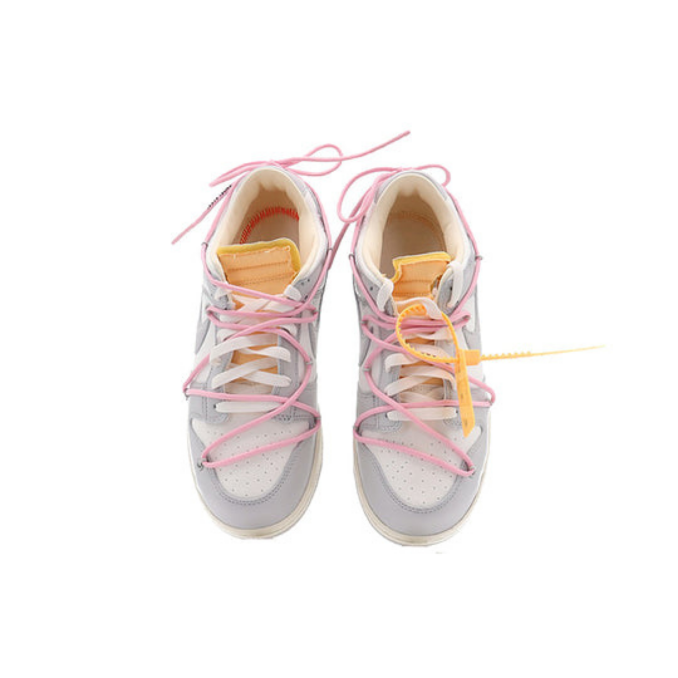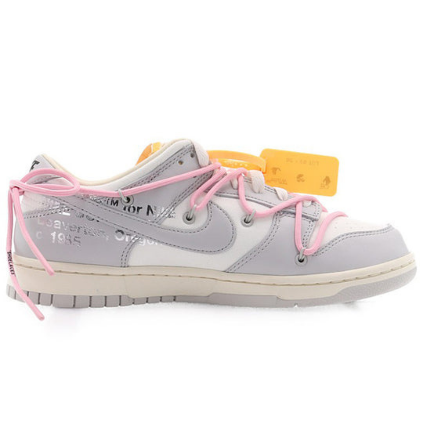 The Off-White x Nike Dunk Low ‘Lot 09 of 50’ from Virgil Abloh’s extensive “The 50” collection delivers a refined yet eye-catching design. This iteration features a grey canvas upper, creating a neutral backdrop that complements the striking red leather overlays. These vivid accents bring a burst of energy and contrast sharply against the muted base, highlighting Abloh’s flair for incorporating vibrant elements into classic designs. Signature Off-White features, such as the orange zip-tie, an innovative secondary lacing system, and printed text on the medial side, maintain the brand’s industrial aesthetic. The exposed foam on the tongue and a pre-distressed sole add a touch of deconstruction, embodying the collection’s theme of reimagined simplicity mixed with bold detailing. ‘Lot 09’ is ideal for those who appreciate a standout sneaker that blends contemporary artistry with streetwear sensibility.